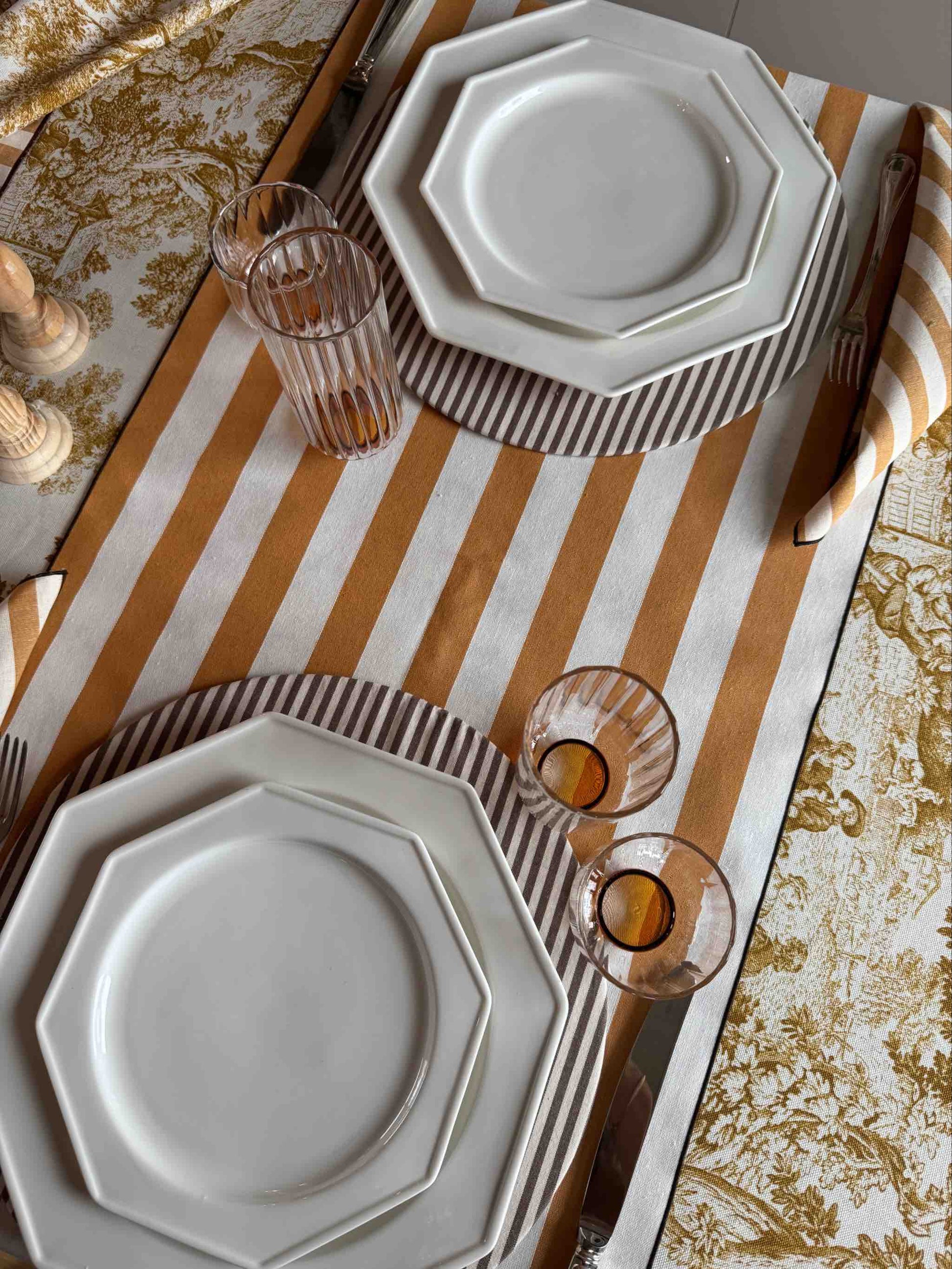 Il motivo a righe ocra e avorio dona un tocco moderno e solare, perfetto per decorare la tavola in ogni stagione. Il runner è ideale sia per l’uso quotidiano che per occasioni speciali, abbinato a tovaglie tinta unita o fantasie classiche come la toile de Jouy.