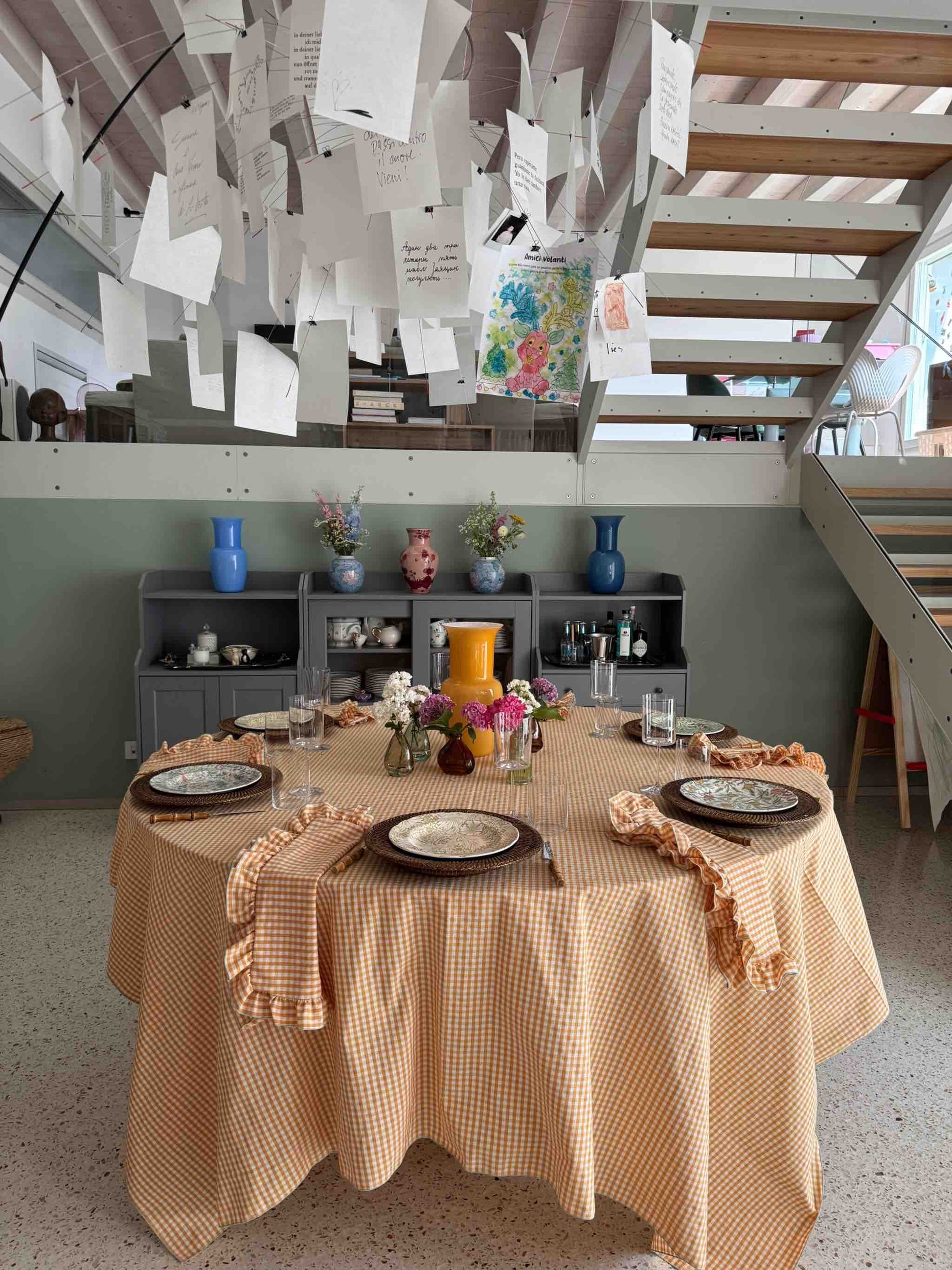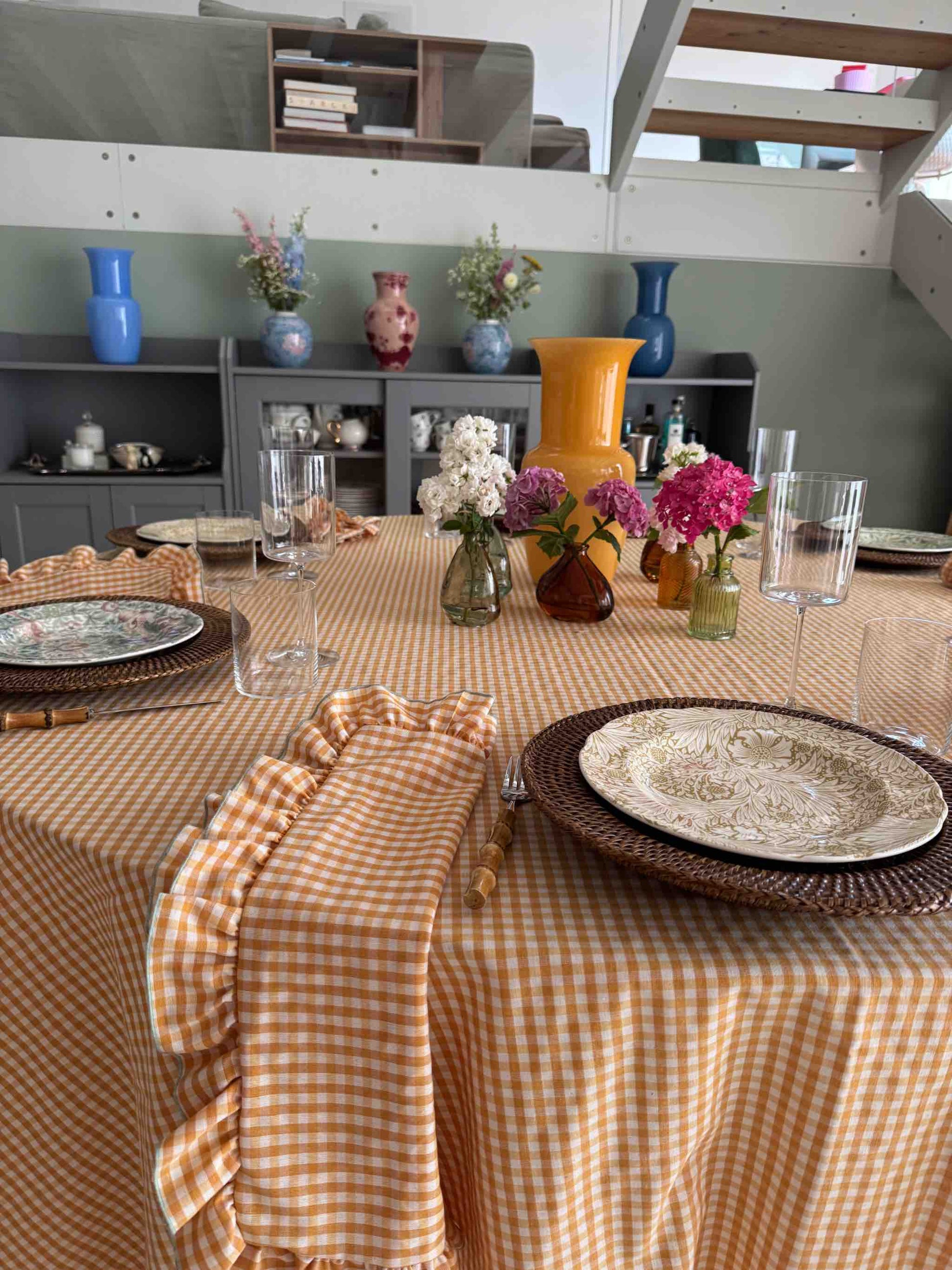 La tovaglia è rifinita con orlo in filo, disponibile in diversi colori a scelta. Ogni tovaglia è confezionata artigianalmente su misura: puoi selezionare le misure più comuni oppure richiedere una realizzazione personalizzata, anche rotonda o ovale, scrivendomi direttamente in chat.
