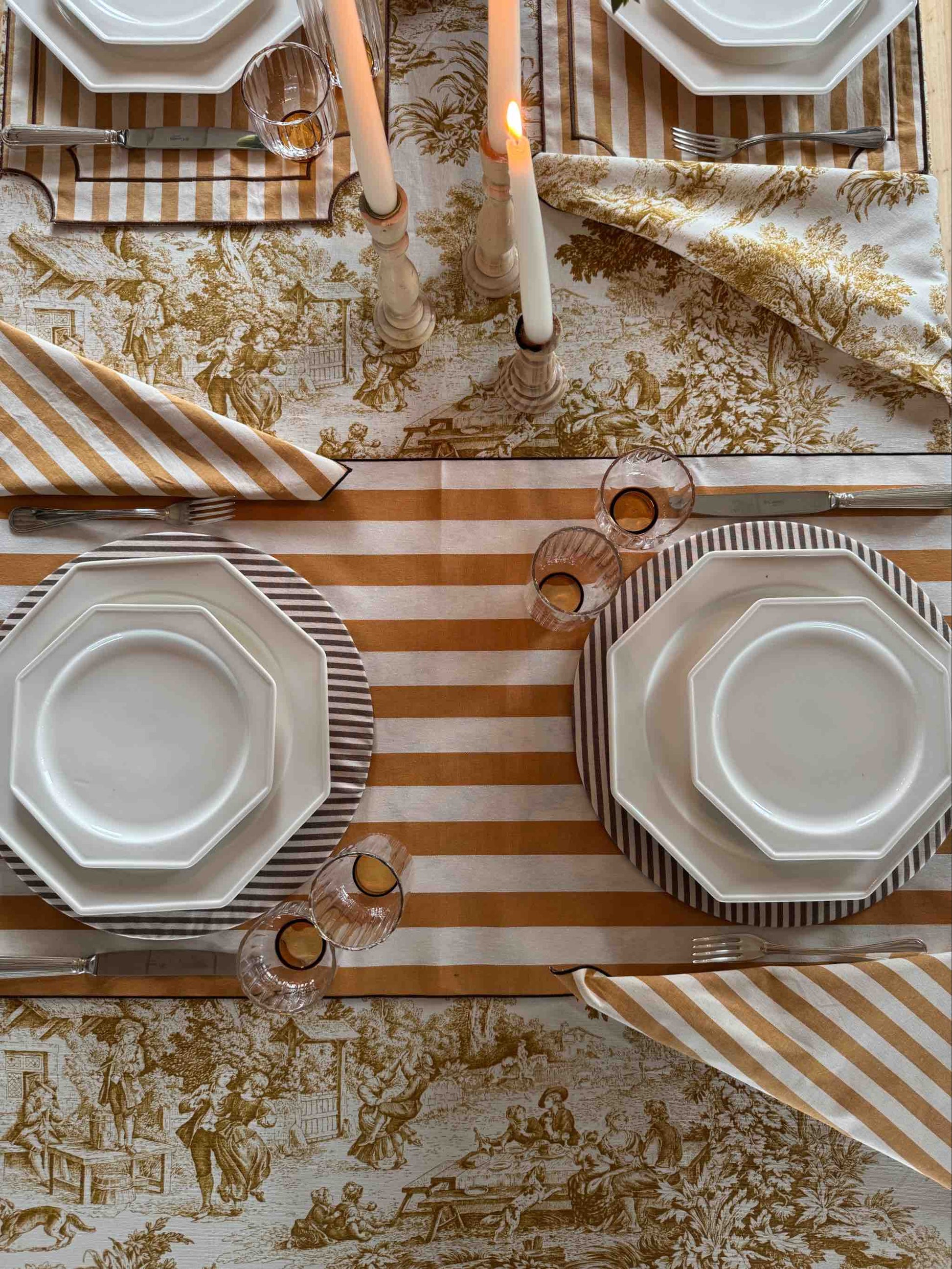 Raffinata ed elegante, la tovaglia su misura in cotone toile de Jouy con bordo e dettagli a righe senape è perfetta per chi ama le tavole curate e l’artigianalità del made in Italy. Realizzata in 100% cotone tinto in filo, unisce il fascino classico della stampa toile de Jouy con la modernità delle righe, creando un equilibrio armonioso tra tradizione e design contemporaneo.